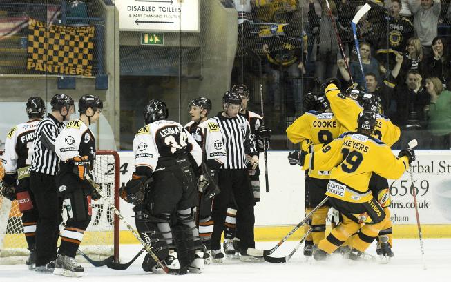 The Nottingham Panthers celebrate a goal against arch rivals the Sheffield Steelers.